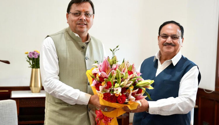 नई दिल्ली – मुख्यमंत्री पुष्कर सिंह धामी ने आज नई दिल्ली में भारतीय जनता पार्टी के राष्ट्रीय अध्यक्ष जेपी नड्डा से भेंट कर उन्हें केंद्रीय स्वास्थ्य एवं परिवार कल्याण मंत्री एवं राज्यसभा में सदन के नेता का दायित्व मिलने पर बधाई एवं शुभकामनाएं दीं। इस दौरान मुख्यमंत्री ने उन्हें हाउस ऑफ हिमालयाज ब्रांड के स्थानीय उत्पाद भी भेंट किए।
