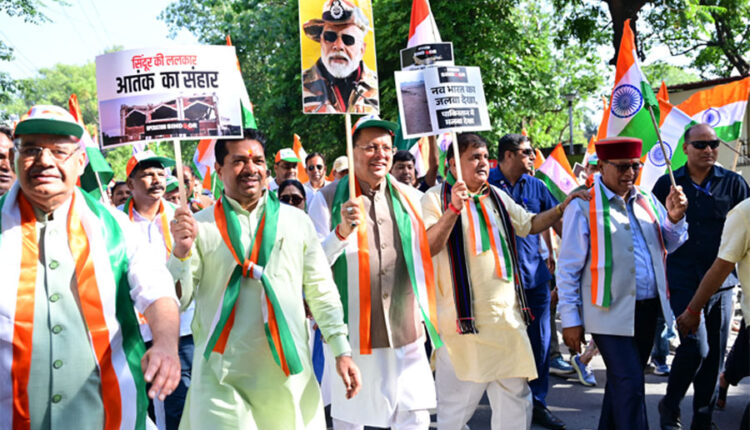 देहरादून। मुख्यमंत्री पुष्कर सिंह धामी के नेतृत्व में बुधवार को शौर्य स्थल चीड़बाग से गांधी पार्क तक भव्य “तिरंगा शौर्य सम्मान यात्रा” का आयोजन किया गया। यह यात्रा हाल ही में भारतीय सशस्त्र बलों द्वारा सफलता पूर्वक चलाए गए “ऑपरेशन सिंदूर” की ऐतिहासिक विजय को समर्पित रही। हजारों की संख्या में आमजन, पूर्व सैनिक, युवा वर्ग एवं मातृशक्ति ने तिरंगे के साथ पद यात्रा में भाग लिया। मुख्यमंत्री ने इस अवसर पर शौर्य स्थल पर पुष्प चक्र अर्पित कर शहीद जवानों को श्रद्धांजलि भी दी।